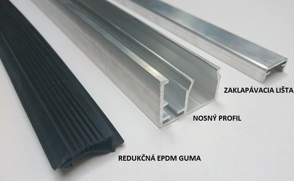 Do profilu je možné vložiť aj tenšie materiály za pomoci EPDM redukčnej gumy (skladom redukcia z 10mm na 6mm, 4mm, 3mm), ktorá sa nasunie na materiál a následne vloží do nosného profilu.